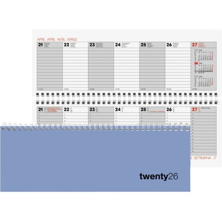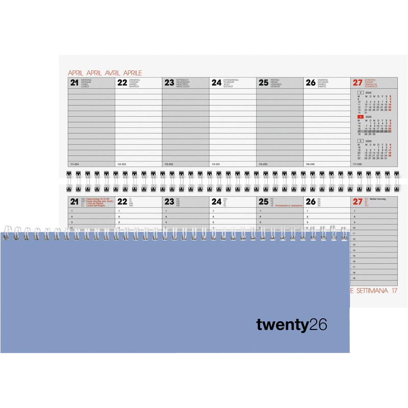 BIELLA Pultagenda Colorful 1 Woche auf 2 Seiten, Einband aus Karton, laminiert, Kalendarium viersprachig d/f/i/gb, querliniert, untere Seite mit Stunden-Einteilung (07.00 - 19.00 Uhr), zusätzliche Jahres- und Monatsseiten, Doppelseite mit 3-Monats-Übersicht, Wire-O-Bindung, Format 29,7 x 10,5 cm. Nachhaltigkeit eco:plus: Zertifikat: FSC. blau