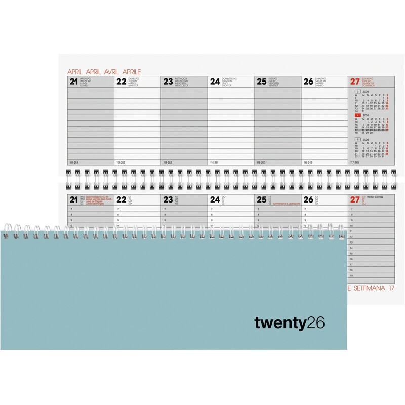 BIELLA Pultagenda Colorful 1 Woche auf 2 Seiten, Einband aus Karton, laminiert, Kalendarium viersprachig d/f/i/gb, querliniert, untere Seite mit Stunden-Einteilung (07.00 - 19.00 Uhr), zusätzliche Jahres- und Monatsseiten, Doppelseite mit 3-Monats-Übersicht, Wire-O-Bindung, Format 29,7 x 10,5 cm. Nachhaltigkeit eco:plus: Zertifikat: FSC. salbeigrün