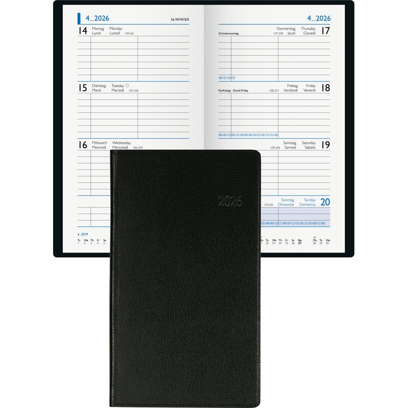 BIELLA Taschenagenda Budget 1 Woche auf 2 Seiten, Einband aus Kunstleder, Kalendarium viersprachig d/f/i/gb, querliniert, zusätzliche Jahres- und Monatsseiten, Doppelseite mit Monatsübersicht, Format: 8,7 x 15,3 cm. Nachhaltigkeit eco:plus: Zertifikat: FSC. schwarz