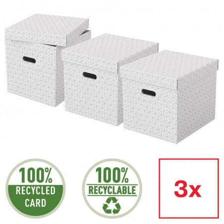 ESSELTE® Archiv-Boxen aus 100% recyceltem Wellkarton, robustes, elegantes Design, abnehmbarer Deckel, flach geliefert, zum Selbstmontieren, beschichtete und abwischbare Oberfläche. Packung zu 3 Stück. Nachhaltigkeit eco:plus: recyclingfähig, recycelter Bestandteil. Zertifikat: FSC. Cube mit Griffloch
