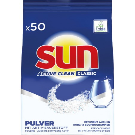 SUN® Geschirrspülmittel Classic Active Clean kraftvolle Basis-Reinigung mit Aktiv-Sauerstoff, greift hartnäckigen Schmutz erfolgreich an, kein Vorspülen nötig, pflegt Geschirrspüler bei jedem Spülgang, leistungsstark auch in Eco- und Kurzprogrammen, für Geschirrspüler. Pulver