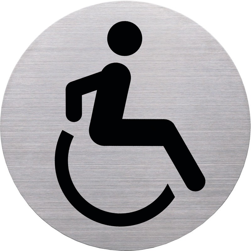 HELIT Wand-/Tür-Piktogramm the badge aus gebürstetem Edelstahl, schwarzer Druck, selbstklebend durch Klebeband, Ø 115 mm. Blister zu 1 Stück. Nachhaltigkeit eco:plus: verlängertes Produktleben, recyclingfähig, Recycelgehalt Abfall nach Gebrauch max. 100%, Abfallminderung.