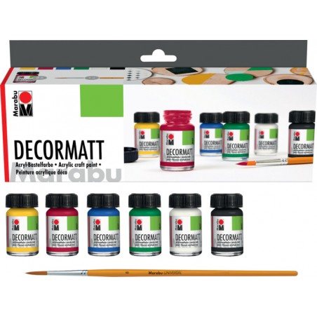 MARABU Decormatt Acryl samtmatte Acrylfarbe auf Wasserbasis, wetterfest, hervorragende Deckkraft und sehr gute Lichtechtheit, geeignet für Holz, Karton, Papier, Styropor, Glas, Metall, Stein etc. Nachhaltigkeit eco:plus: recyclingfähig, umweltfreundliche Verpackung. Set zu 6 Farben, Inhalt 15 ml, 1 Pinsel rund Grösse 8 gelb, rot, blau, grün, weiss und schwarz.