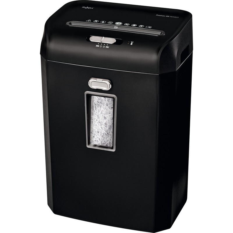 REXEL® Aktenvernichter Promax REX823 23 l Auffangbehälter mit Sichtfenster, volle DIN A4-Arbeitsbreite von 220 mm, Sicherheitsstufe P-4, schneidet bis zu 8 Blatt pro Vorgang, vernichtet Heft- und Büroklammern und Kreditkarten, Motorleistung: 240 W, geräuscharmer Betrieb, unter 60 dBA, LED-Leuchtanzeigen für Überhitzung, automatische An- und Abschaltung, Rücklaufmodus. Masse: B 335 x H 460 x T 240 mm. Gewicht: 6 kg. Preis inkl. VRG. Zertifikat: CE, TÜV/GS.