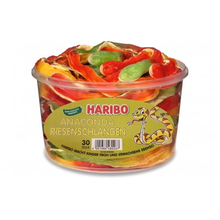 Mit 35cm Länge und 40g Gewicht sind die Anaconda Riesenschlangen wirklich XXL. Dieser Stückartikel ist eine Kombination aus Fruchtgummi und Schaumzucker und in den Geschmacksrichtungen Saftorange/Erdbeere, Himbeere/Erdbeere und Himbeere/Zitrone in der Dose erhältlich.