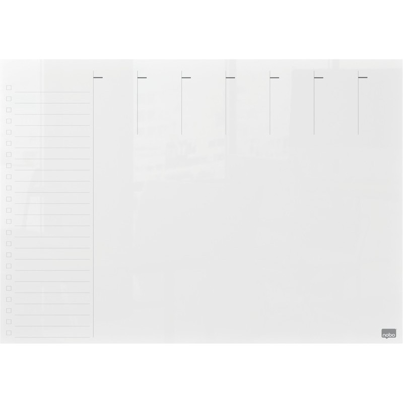 NOBO® Wochenplaner Acryl A4 transparente, trocken abwischbare, Acrylglasoberfläche, rahmenloses Design, Befestigung an Wänden durch Klebepads oder mit Magneten auf Metalloberflächen, mit Wochenraster und To-do-Liste, inkl. NOBO® Stift und Klebepads für die Befestigung. Masse: B 297 x H 210 x T 8 mm. Gewicht: 400 g.