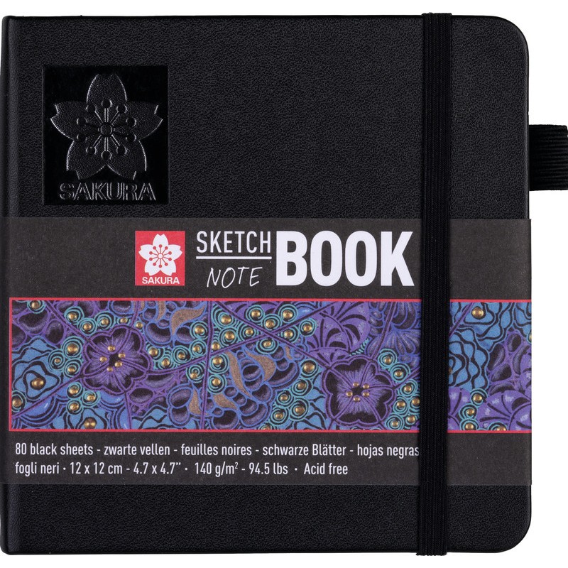 SAKURA® Skizzenbuch Sketch Book Einband aus stabilem Karton, aussen kaschiert mit Kunstleder, Zeichenpapier schwarz, 140 g/m2, säurefrei, abgerundete Ecken, Gummibandverschluss, Stiftschlaufe, Lesezeichen, geeignet für Skizzieren, SAKURA® Stifte, Tinte, Ölpastell und Kreide, 160 Seiten.