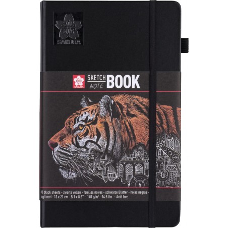 SAKURA® Skizzenbuch Sketch Book Einband aus stabilem Karton, aussen kaschiert mit Kunstleder, Zeichenpapier schwarz, 140 g/m2, säurefrei, abgerundete Ecken, Gummibandverschluss, Stiftschlaufe, Lesezeichen, geeignet für Skizzieren, SAKURA® Stifte, Tinte, Ölpastell und Kreide, 160 Seiten.
