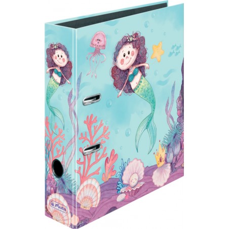 HERLITZ Ordner Mermaid aus stabilem Karton, Innenspiegel schwarz bedruckt, aussen vollflächig bedruckt, mit Raumsparösen und Griffloch, Hebelmechanik, Rückenbreite 8 cm, für Format A4. Nachhaltigkeit eco:plus: verlängertes Produktleben, recyclingfähig. Zertifikat: FSC.