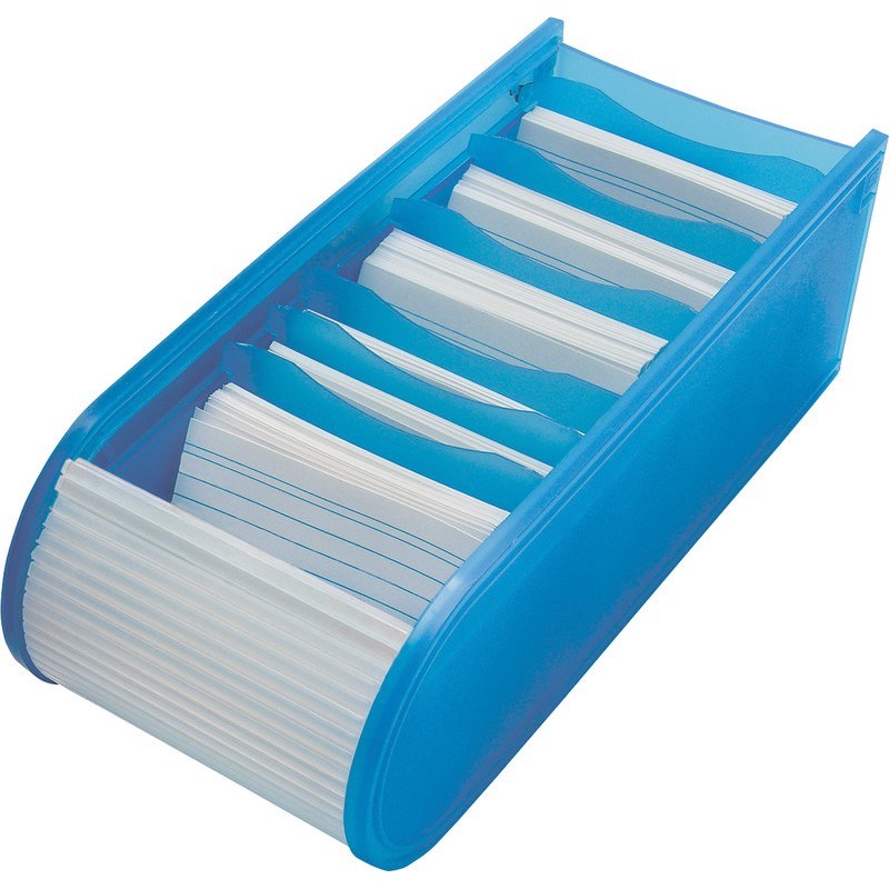 WEDO® Karteikasten aus transluzentem Kunststoff, Fassungsvermögen bis 500 Karten, inkl. 100 Karten A8 liniert und 6 Schwenkplatten. Aussenmasse: B 92 x H 73 x L 217 mm.