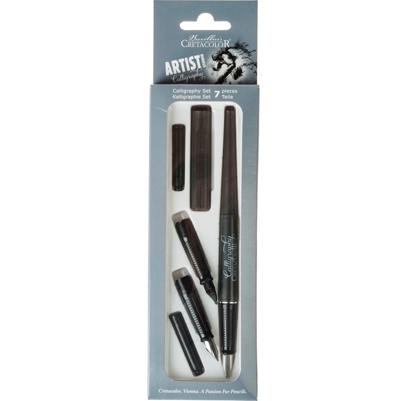 CRETACOLOR® Calligraphy Set mit Bandzugfeder, für die klassische Calligraphy , Schaft und Kappe aus Kunststoff, Edelstahlfeder, für Rechts- und Linkshänder geeignet. Set zu 1 Füllfederhalter Calligraphy, je 1 Vorderteil mit den Strichbreiten 1,1 mm, 1,5 mm und 2,3 mm und 3 Tintenpatronen.