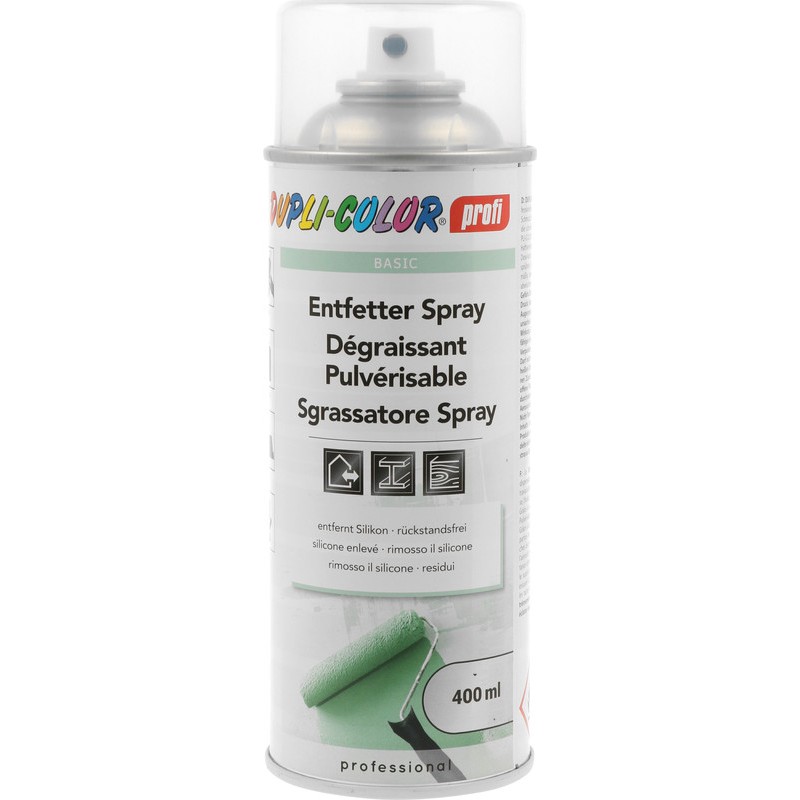DUPLI-COLOR PROFI® Entfetter Spray sichere Entfernung von Schmutz, Öl, Silikon, Wachs, Teer, Klebstoffreste usw., verstärkt das Haftvermögen nachfolgender Lackierungen, nicht aggressive Lösungsmittel. Dose zu 400 ml.