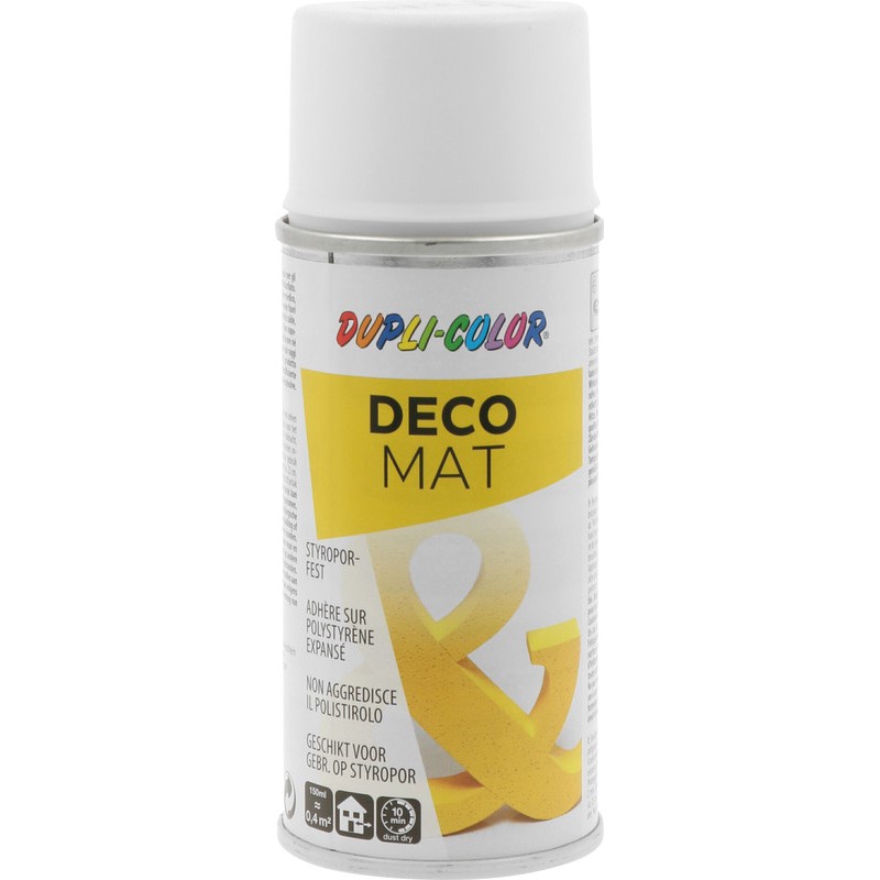 DUPLI-COLOR® Farbspray Deco Mat matt, styroporfester Acryllack mit Speziallösemittel, deckend, gleichmässiges Farbergebnis, trocknet schnell, staubtrocken nach ca. 10 Min., grifffest nach 30 Min., durchgetrocknet nach ca. 24 Std., hält dauerhaft im Innen- und Aussenbereich, kratz-, stoss- und schlagfest, lichtecht, UV-Beständig, geeignet für Styropor, Metall, Holz, Glas, Keramik, Eternit, Beton, Stein, Papier, Karton, lackierfähige Hartkunststoffe, Blumen usw. Dose zu 150 ml.