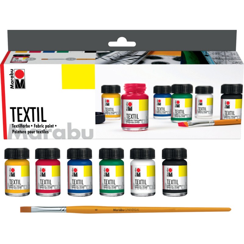 MARABU Stoffmalfarbe Textil universelle Stoffmal- und Druckfarbe auf Wasserbasis, zum Fixieren ohne Dampf bügeln, waschmaschinenbeständig bis 60°C, Farbton hat eine gute Lichtechtheit, untereinander mischbar und mit Wasser verdünnbar, für helle Stoffe, geeignet für alle appreturfreien Textilien aus Baumwoll-, Leinen-, Jute-, Seide-, Misch- und Synthetikgewebe. Set zu 6 Farben, Inhalt 15 ml mittelgelb, karminrot, mittelblau, hellgrün, weiss und schwarz.