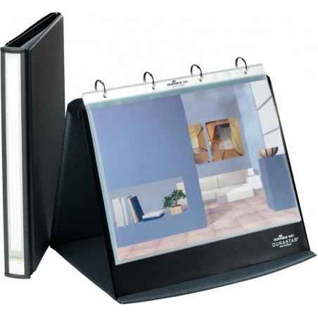 DURABLE Tisch-Flipchart Durastar® A4 quer aus Kunststoff in der Farbe basalt (gesprenkelt), geschlossen wie ein Ordner, schmaler Kunststoffrücken mit Beschriftungsfeld, mit Klettverschluss, 4-Ring-Mechanik, fasst max. 30 Zeigebuchtaschen, inkl. 10 Zeigebuchtaschen. Nachhaltigkeit eco:plus: recyclingfähig, recycelter Bestandteil, Recycelgehalt Abfall nach Gebrauch max. 15%.