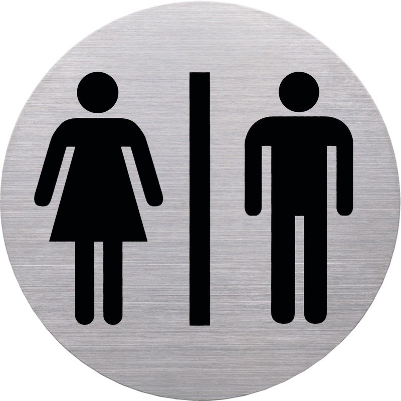 HELIT Wand-/Tür-Piktogramm the badge aus gebürstetem Edelstahl, schwarzer Druck, selbstklebend durch Klebeband, Ø 115 mm. Blister zu 1 Stück. Nachhaltigkeit eco:plus: verlängertes Produktleben, recyclingfähig, Recycelgehalt Abfall nach Gebrauch max. 100%, Abfallminderung.