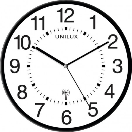 UNILUX Wanduhr Wave Gehäuse aus ABS, Abdeckung aus Glas, geräuscharm, Sekundenzeiger, Funkuhr, mit automatischer Sommer- und Winterzeiteinstellung, Batteriebetrieb 1 x AA (mitgeliefert). Masse: Ø 300 mm, T 42 mm. Preis inkl. VRG. Nachhaltigkeit eco:plus: recyclingfähig, Abfallminderung. Zertifikat: CE.