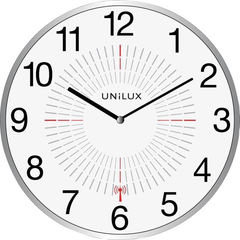 UNILUX Wanduhr Outdoor Gehäuse aus Metall, Abdeckung aus Glas, Funkuhr, lautloses Quarzuhrwerk, geräuscharm, mit automatischer Sommer- und Winterzeiteinstellung, wetterfest, für den Innen- und Aussenbereich geeignet, Batteriebetrieb 1 x AA 1,5 V (mitgeliefert). Masse: Ø 355 mm, T 60 mm.