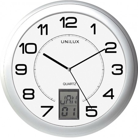 UNILUX Wanduhr Instinct Gehäuse aus ABS, Abdeckung aus Glas, geräuscharm, Sekundenzeiger, LCD-Anzeige, wahlweise Monat/Tag, Stunde/Minute oder Tag/Datum, in 10 Sprachen programmierbar (deutsch, französisch, italienisch, englisch, spanisch, niederländisch, schwedisch, dänisch, portugiesisch und polnisch), Batteriebetrieb 1 x AA (mitgeliefert). Masse: Ø 305 mm, T 40 mm. Nachhaltigkeit eco:plus: recyclingfähig, Abfallminderung. Zertifikat: CE. Preis inkl. VRG.