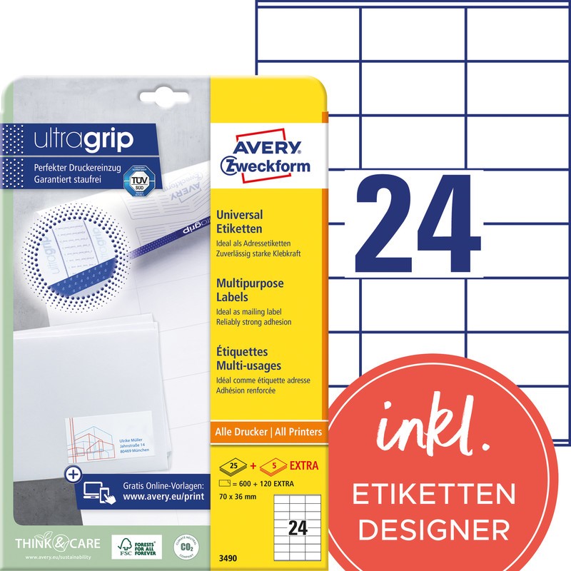 AVERY® ZWECKFORM Etiketten Universal ultragrip selbstklebende, weisse Etiketten auf Blättern DIN A4, einzigartige ultragrip-Technologie auf dem Bogen garantiert präzisen Druckereinzug und staufreies Drucken, sicherer Durchlauf, ausgezeichnete Tonerhaftung, kein Verlaufen der Tinte. Geeignet für Kopierer, Laser-/Inkjetdrucker und Farblaserdrucker/-kopierer. Nachhaltigkeit eco:plus: umweltfreundliche Verpackung. Zertifikat: FSC, TÜV. Packung zu 25 + 5 Blatt extra