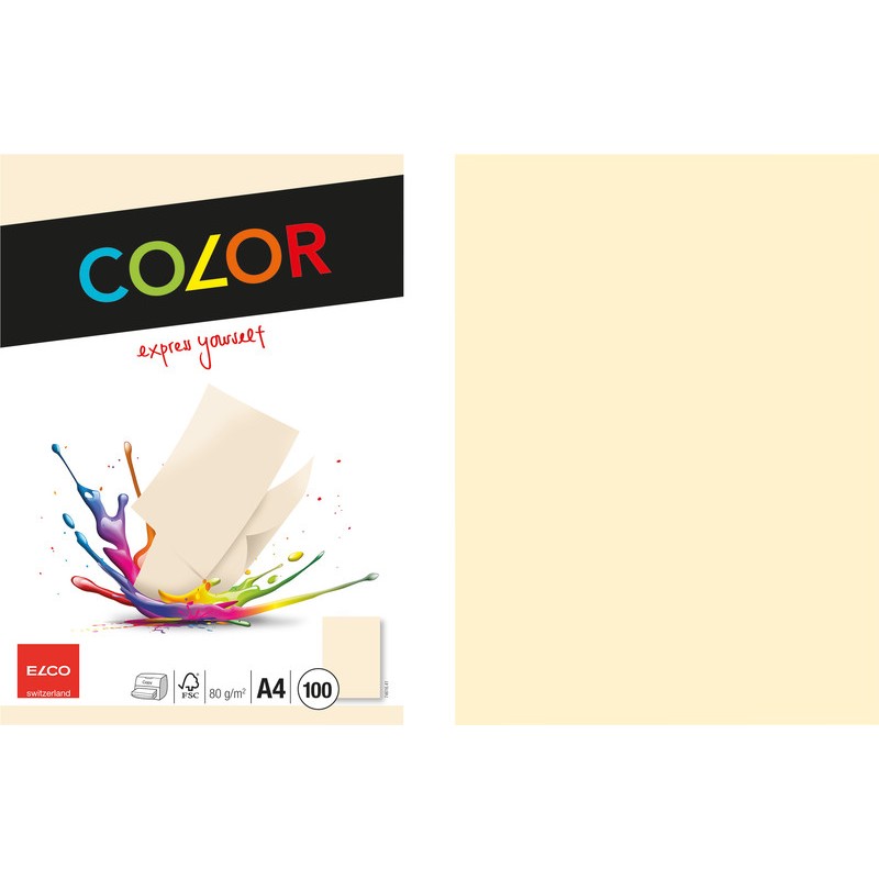 ELCO Universalpapier Color Format A4, 80 g/m2. Geeignet für Kopierer, Laser-/ Inkjetdrucker und Farblaserdrucker/ -kopierer. Nachhaltigkeit eco:plus: recyclingfähig. Zertifikat: FSC. farbenrein Packung zu 100 Blatt.
