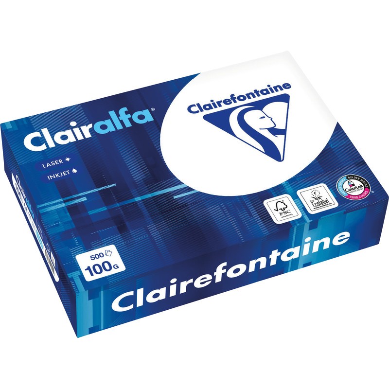 CLAIREFONTAINE Universalpapier Clairalfa Premium, hochweiss für höchste Ansprüche, elementarchlorfrei. Weissegrad: 171 CIE. Geeignet für Kopierer, Laser-/Inkjetdrucker und Farblaserdrucker/-kopierer. Nachhaltigkeit eco:plus: abbaubar, recyclingfähig. Zertifikat: FSC, EU Ecolabel. Packung zu 500 Blatt