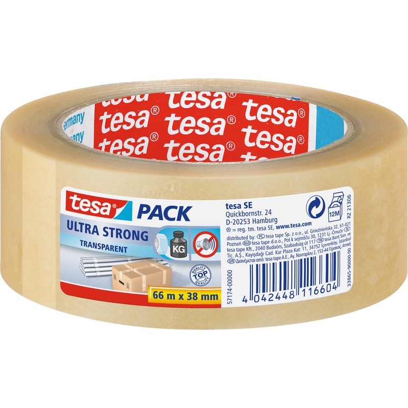 TESA® Verpackungsband PVC ultra strong mit Naturkautschuk-Klebmasse, sehr starke Klebkraft, extrem reissfest, für schwere bis mittelschwere Pakete, gleichmässiges und geräuschloses Abrollen.