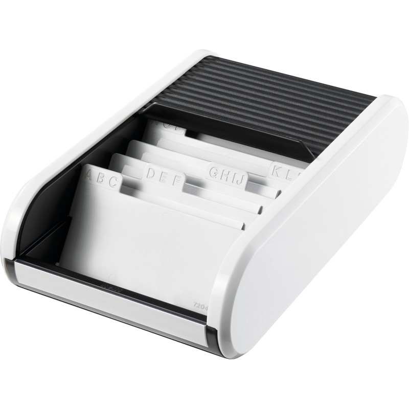 HELIT Visitenkartenkasten the personal aus PS, 8-teilige alphabetische Unterteilung, Rolloverschluss, für ca. 300 Visitenkarten. Masse: B 136 x H 67 x T 240 mm. Nachhaltigkeit eco:plus: verlängertes Produktleben, recyclingfähig, Recycelgehalt Abfall nach Gebrauch max. 100%, Abfallminderung, umweltfreundliche Verpackung.