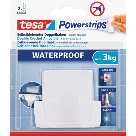 TESA® Powerstrips® Waterproof Wave Doppelhaken für Duschwischer zur Befestigung von Gegenständen auf Fliesen oder Glas in Dusche oder Bad, inkl. Primer Tuch zur Vorbehandlung der Oberfläche, Haken aus PS, spurlos ablösbar, Belastbarkeit bis 3 kg. Blister zu 1 Haken und 2 Powerstrips®.
