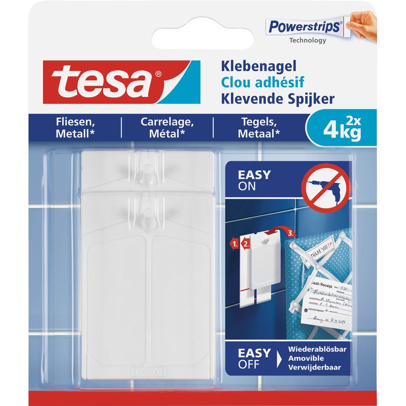 TESA® Powerstrips® Klebenagel für Fliesen & Metall zur Befestigung von Küchenutensilien auf glatten, festen Untergründen im Innenbereich, z. B. Fliesen und Metall, spurlos ablösbar, wiederverwendbar mit neuem Powerstrips®. Blister zu 2 Stück. Belastbarkeit bis 4 kg
