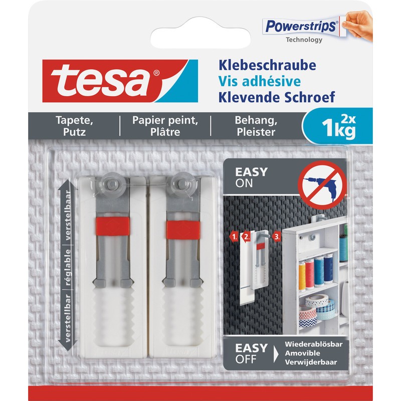 TESA® Powerstrips® Klebeschraube für Tapete & Putz verstellbar zur Befestigung von dekorativen Gegenständen auf empfindlichen, strukturierten Untergründen, spurlos ablösbar, wiederverwendbar mit neuem Powerstrips®, Belastbarkeit bis 1 kg. Blister zu 2 Stück.