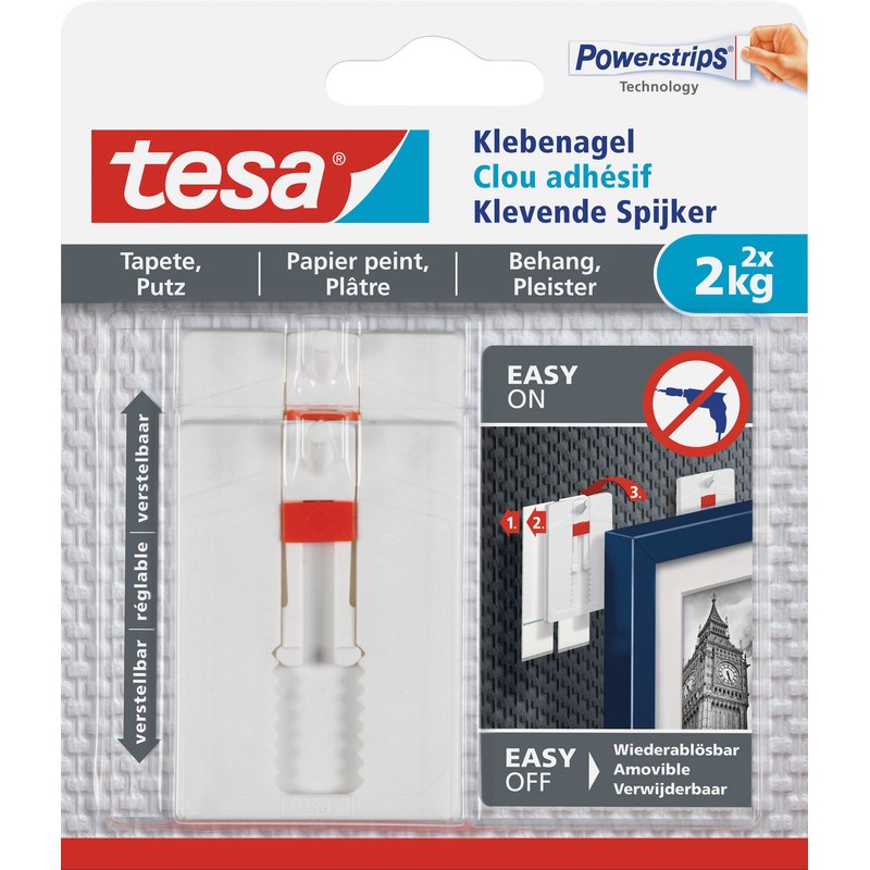 TESA® Powerstrips® Klebenagel für Tapete & Putz verstellbar zur Befestigung von dekorativen Gegenständen auf empfindlichen, strukturierten Untergründen, spurlos ablösbar, wiederverwendbar mit neuem Powerstrips®. Belastbarkeit bis 2 kg Blister zu 2 Stück.