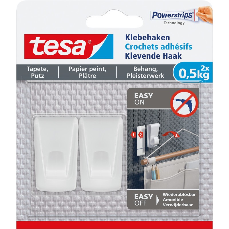 TESA® Powerstrips® Klebehaken Tapete & Putz zum Aufhängen von leichteren Gegenständen wie z. B. Lichterketten, Girlanden, Mobiles etc. auf empfindlichen, strukturierten Untergründen, vielseitig anwendbar an Wänden und Decken, spurlos ablösbar, wiederverwendbar mit neuem Powerstrips®, Belastbarkeit bis 0,5 kg. Blister zu 2 Haken und 3 Powerstrips®.