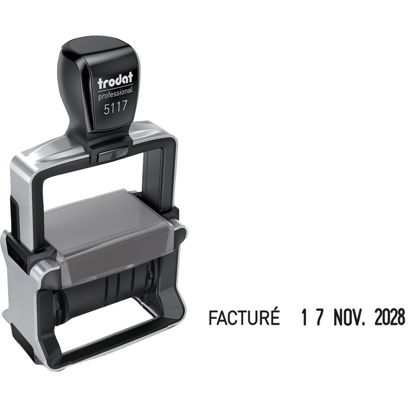 TRODAT® Professional(TM) 4.0 selbstfärbender Wort- und Datumstempel 5117 Metallstempel mit hoher Langlebig- und Strapazierfähigkeit, mit verstellbaren Gummibändern, mit verschiedenen Standardtexten in Verbindung mit dem Datum, einfaches Wechseln der Texte durch Einstellrad, Kissentränkung schwarz, auswechselbar. Texte: EINGEGANGEN, BEANTWORTET, ERLEDIGT, BESTELLT, GEMAHNT, BEZAHLT, ÜBERWIESEN, BETRAG ERH., FAKTURIERT, KONTROLLIERT, GEBUCHT, TERMIN. Zertifikat: CO2-neutral.