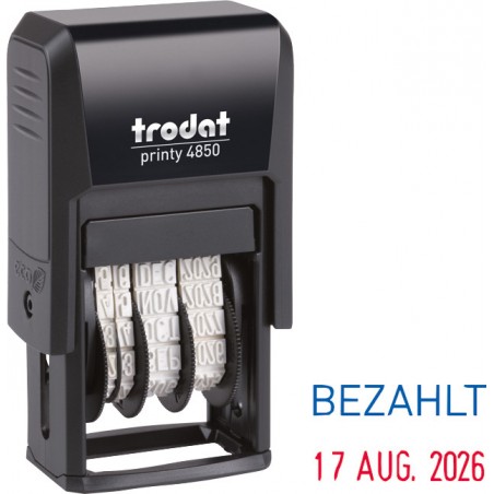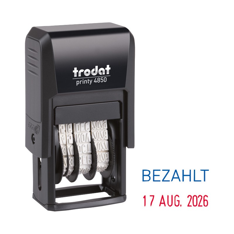 TRODAT® Printy(TM) 4850/L, selbstfärbender Datumstempel mit Standardtext serienmässig CO2 kompensiert produziert, Kunststoffgehäuse aus 70% Recyclingmaterial, Kissentränkung blau/rot (Text blau, Datum rot), mit auswechselbarem TRODAT® Stempelkissen. Nachhaltigkeit eco:plus: Zertifikat: EU Ecolabel.
