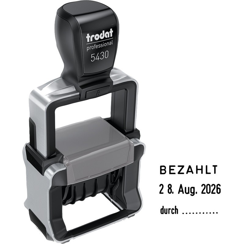 TRODAT® Professional(TM) 4.0 5430 selbstfärbender Text- und Datumstempel Metallstempel mit hoher Langlebig- und Strapazierfähigkeit, integriertes TRODAT® Stempelkissen schwarz, auswechselbar, jedem Stempel liegt ein Gutschein für die Anfertigung der Stempelplatte bei. Garantie: 10 Jahre. Nachhaltigkeit eco:plus: recycelter Bestandteil, Recycelgehalt Abfall vor Gebrauch max. 57%, Recycelgehalt Abfall nach Gebrauch max. 14%.