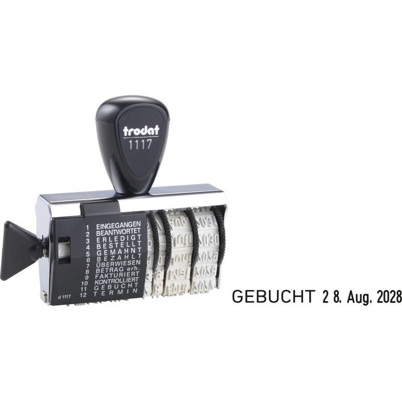 TRODAT® Wort- und Datumstempel 1117 aus Metall, mit Einstellhilfe auf dem Kunststoffgehäuse, verschiedenen Standardtexten auf verstellbaren Gummibändern, in Verbindung mit dem Datum, einfaches Wechseln der Texte durch Einstellrad. Texte: EINGEGANGEN, BEANTWORTET, ERLEDIGT, BESTELLT, GEMAHNT, BEZAHLT, ÜBERWIESEN, BETRAG ERH., FAKTURIERT, KONTROLLIERT, GEBUCHT, TERMIN.