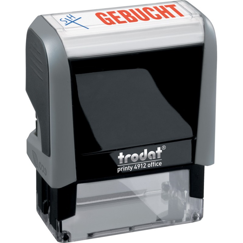 TRODAT® OFFICE Printy(TM) 4912 selbstfärbender Stempel mit Standardtext serienmässig CO2 kompensiert produziert, 2-farbiger Abdruck: Text rot, Logo blau. Abdruckgrösse: B 47 x T 18 mm. Nachhaltigkeit eco:plus: recycelter Bestandteil, Recycelgehalt Abfall vor Gebrauch max. 9%, Recycelgehalt Abfall nach Gebrauch max. 7%. Zertifikat: EU Ecolabel.