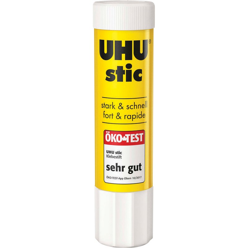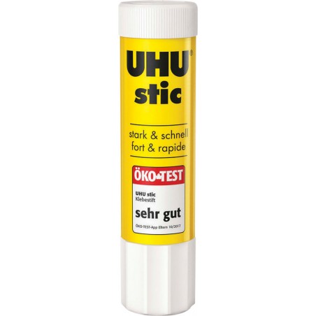 Bâton de colle UHU® stic colle puissante, rapide et permanente pour coller le papier, le carton, les étiquettes et le polystyrène, facile à étaler et lavable, sans solvant, colle composée à 98% de matières premières renouvelables, bouchon à vis empêchant la colle de sécher, boîtier composé de 50% de plastique recyclé.
