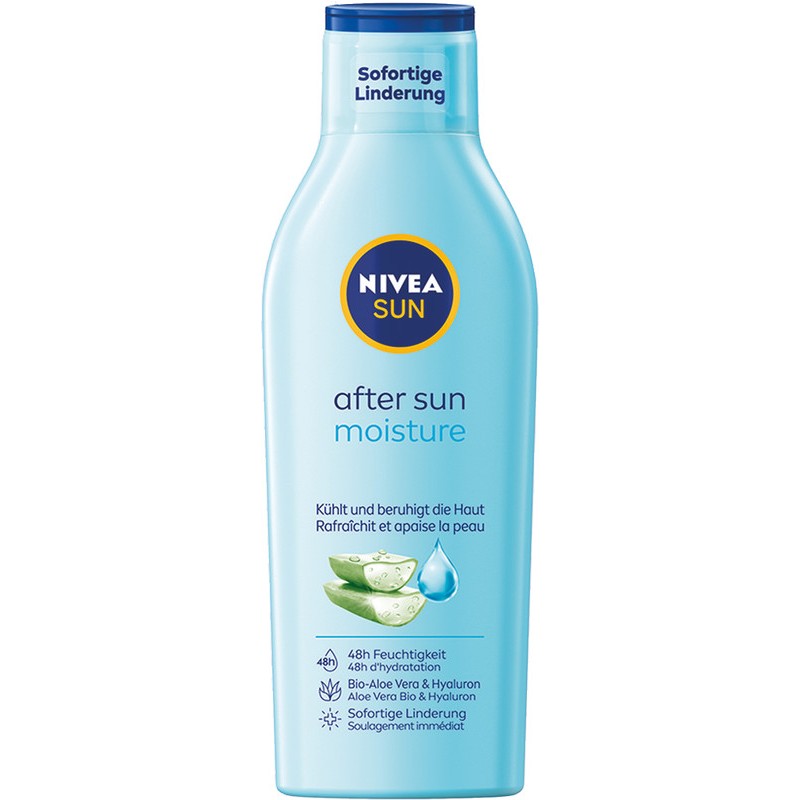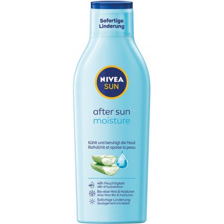After Sun Moisture Lotion NIVEA® pour peaux normales à sensibles, les ingrédients nourrissants hydratent la peau pendant 48 heures, rafraîchit et apaise la peau, atténue immédiatement les signes de peau stressée par le soleil, formule légère avec aloe vera bio et acide hyaluronique, testé dermatologiquement, sans parfum. Bouteille de 200 ml.