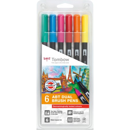 TOMBOW® ABT Dual Brush Pen assortis pointe résistante en nylon 3 - 10 mm, corps en matière plastique, feutre à 2 fonctions, avec une pointe fine 0,3 mm pour les lignes précises et une pointe pinceau conçue pour les traits fins, larges et les surfaces pleines, grand réservoir d'encre pour teinte identique aux deux pointes, encre à base d'eau, capuchon dans la couleur de l'encre, non rechargeable. Durabilité eco:plus: emballage respectueux de l'environnement.