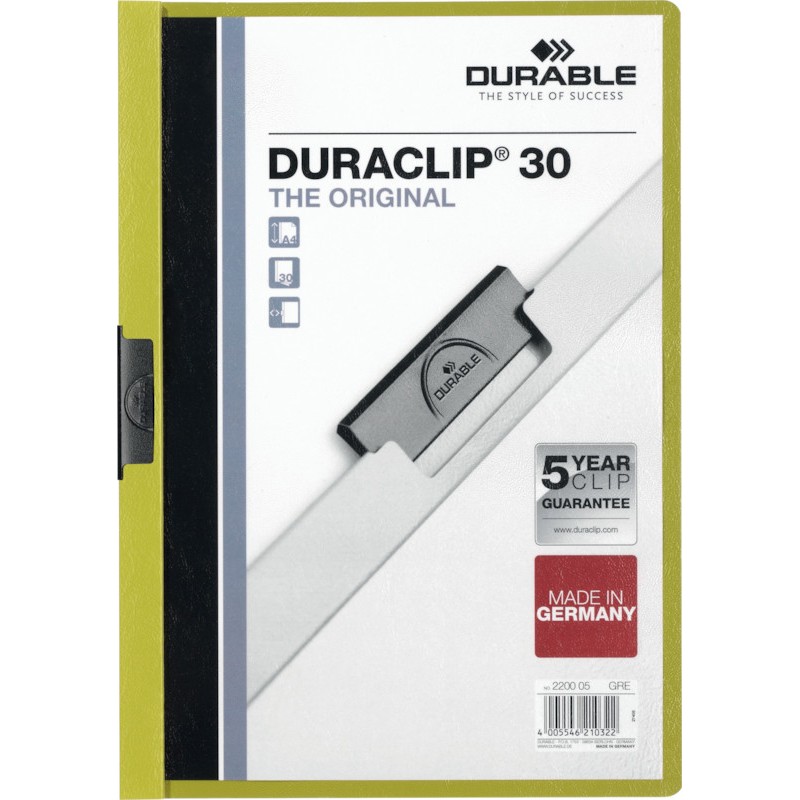 Dossier à pince DURABLE Duraclip® 30 pour documents non perforés, couverture en plastique rigide transparent, dos de couleur, pince en acier, capacité max. 30 feuilles 80 g/m2. Garantie: 5 ans sur la pince. Durabilité eco:plus: recyclable, composant recyclé, teneur en déchets recyclés avant utilisation max. 5%, teneur en déchets recyclés après utilisation max. 2%. pour format A4
