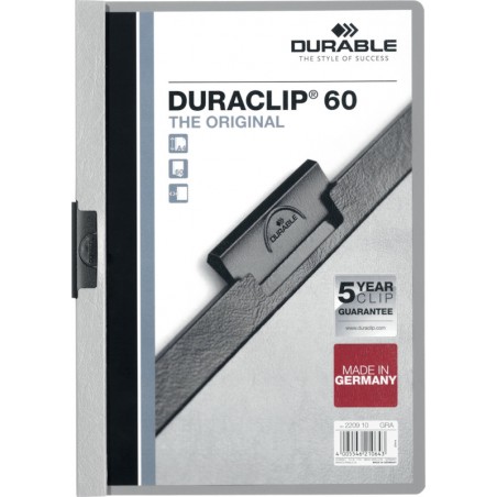 Dossier à pince DURABLE Duraclip® 60 pour documents non perforés, couverture en plastique rigide transparent, dos de couleur, pince en acier, capacité max. 60 feuilles 80 g/m2, pour format A4. Garantie: 5 ans sur la pince. Durabilité eco:plus: recyclable, composant recyclé, teneur en déchets recyclés avant utilisation max. 5%, teneur en déchets recyclés après utilisation max. 2%.