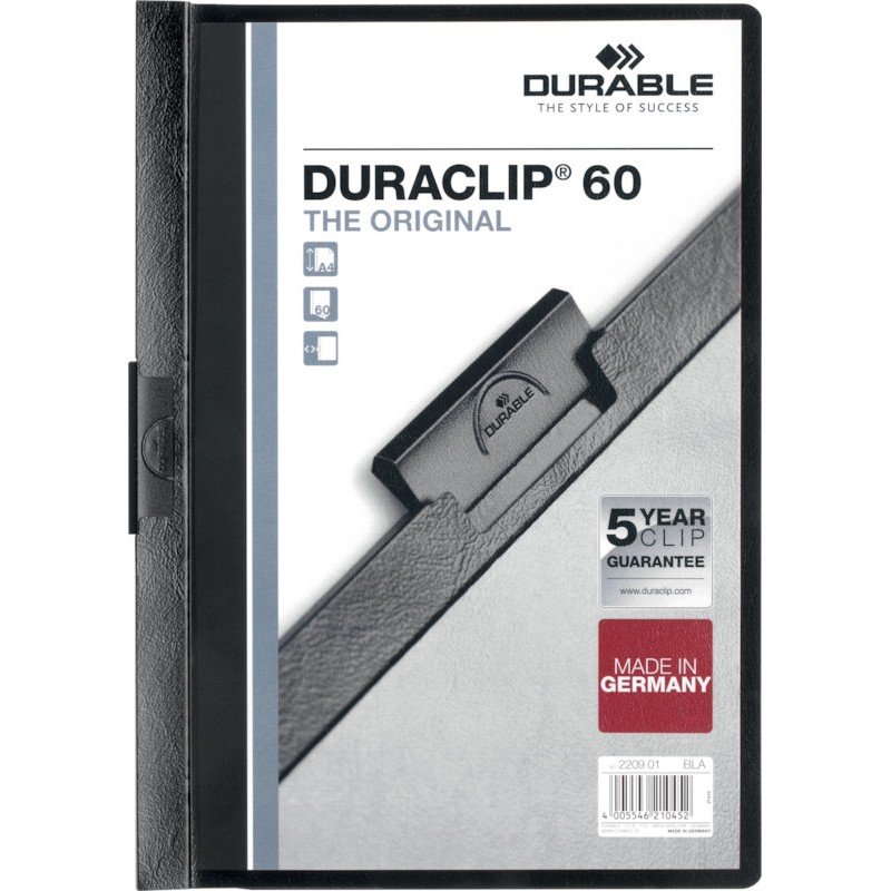 Dossier à pince DURABLE Duraclip® 60 pour documents non perforés, couverture en plastique rigide transparent, dos de couleur, pince en acier, capacité max. 60 feuilles 80 g/m2, pour format A4. Garantie: 5 ans sur la pince. Durabilité eco:plus: recyclable, composant recyclé, teneur en déchets recyclés avant utilisation max. 5%, teneur en déchets recyclés après utilisation max. 2%.