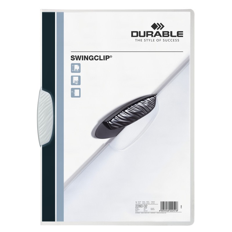 Dossier à pince DURABLE Swingclip® chemise en PP transparent, clip plastique en forme d'ellipse orientable latéralement, capacité max. 30 feuilles 80 g/m2, pour format A4. Durabilité eco:plus: recyclable.