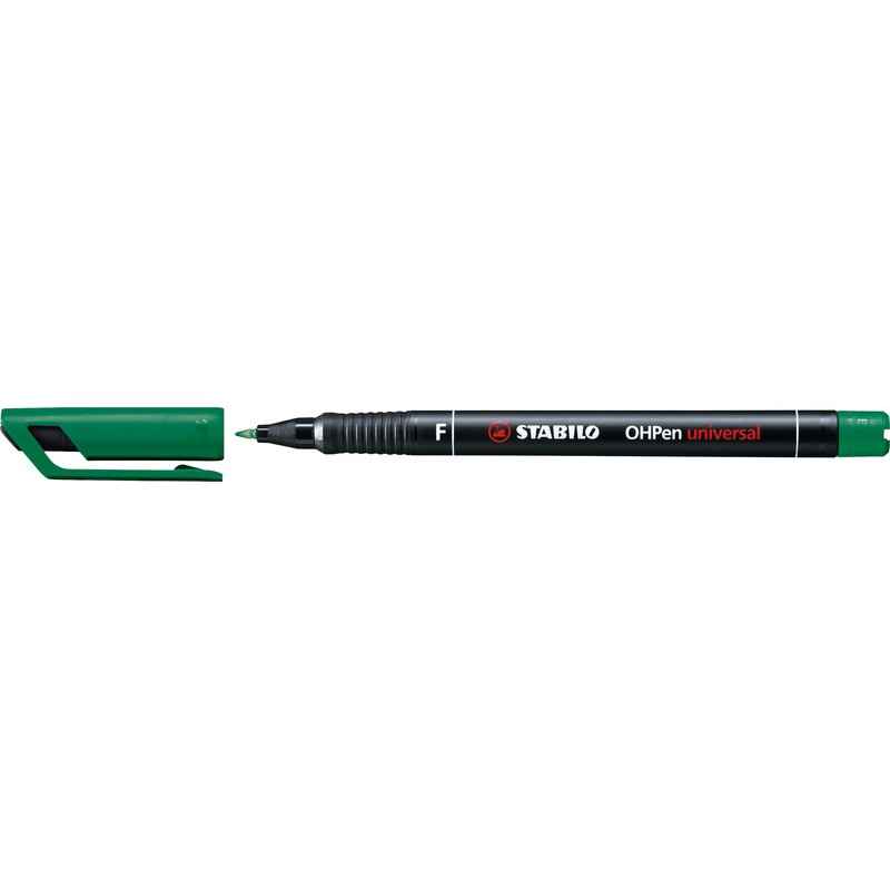 STABILO® OHPen universel permanent clip, stylo-feutre pour transparents, destiné à une utilisation universelle, car ce feutre convient à pratiquement toutes les surfaces lisses, non rechargeable. Durabilité eco:plus: emballage respectueux de l'environnement. fin (F), largeur de trait env. 0,7 mm