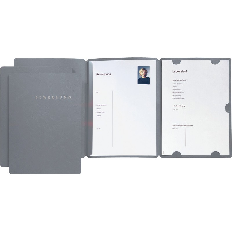 Dossier de candidature PAGNA® Select en carton teinté dans la masse avec surface structurée, avec inscription Bewerbung en relief sur le couvercle antérieur identifie le dossier et lui confère un aspect soigné, 3 rabats avec découpes et baguette de reliure, capacité env. 5 mm, pour format A4.