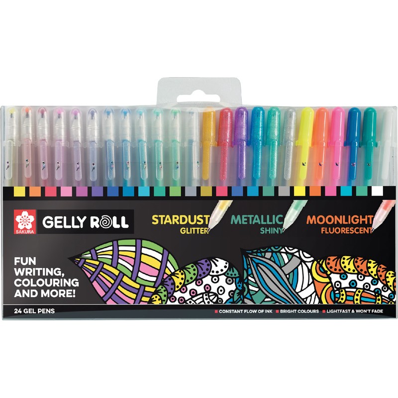 Roller SAKURA® Gelly capuchon avec clip, encre à base d'eau, pour une écriture plus souple et un débit d'encre plus régulier, non rechargeable. Mix contenu: 12 Stardust, 6 Metallic, 5 Moonlight et Basic White.