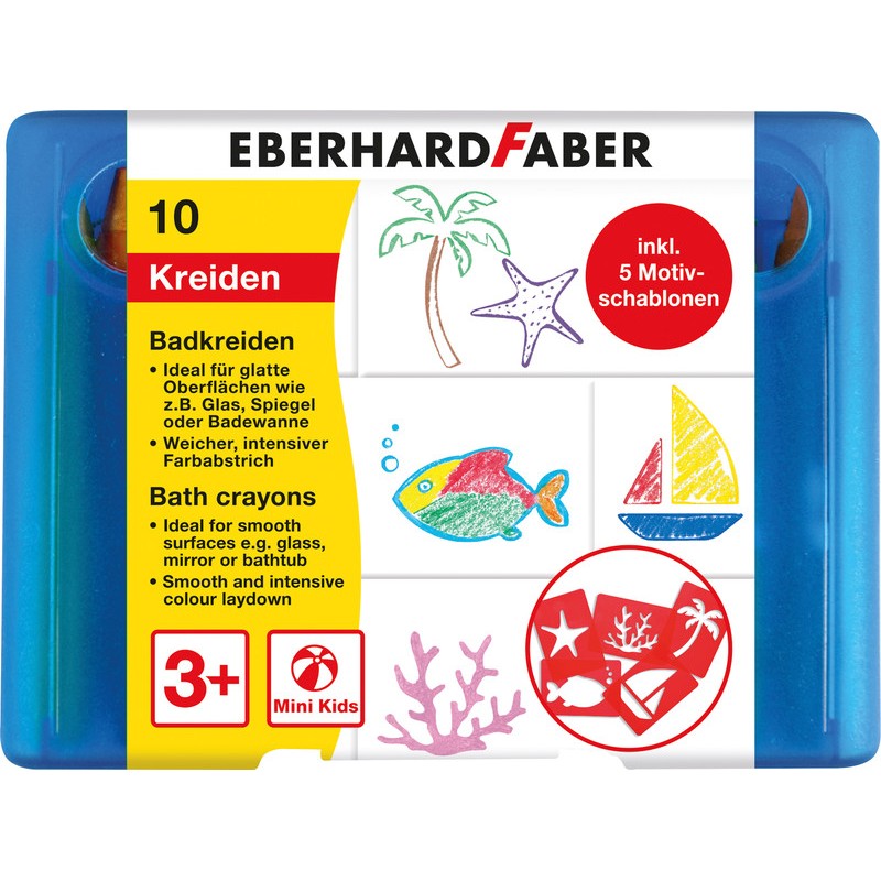 Craies de bain EBERHARD FABER Mini Kids pour décorer les surfaces lisses comme le verre, le miroir ou la baignoire, trait de couleur doux et intense, facile à appliquer et à nettoyer avec de l'eau et une éponge, avec manchon coulissant, dés 3 ans.