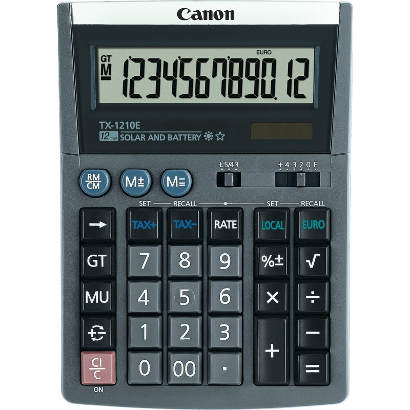 Calculatrice de bureau CANON TX-1210E avec affichage LCD inclinable de 12 chiffres, conversion en euro, calcul de la TVA, 1 mémoire, mémoire GT, touches pourcentage, +/-, racine carrée, touche d'inversion et sélecteur d'arrondi, touche 00. Alimentation double: solaire et pile (LR1130). Dimensions: L 126 x H 30 x P 175 mm. Poids: 172 g. Prix incluant la TAR. Durabilité eco:plus: durée de vie du produit prolongée, composant recyclé.